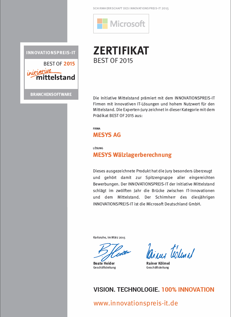 Die MESYS Wälzlagerberechnung wurde beim Innovationspreis IT der Initiative Mittelstand mit dem Prädikat BEST OF 2015 in der Kategorie Branchensoftware ausgezeichnet.