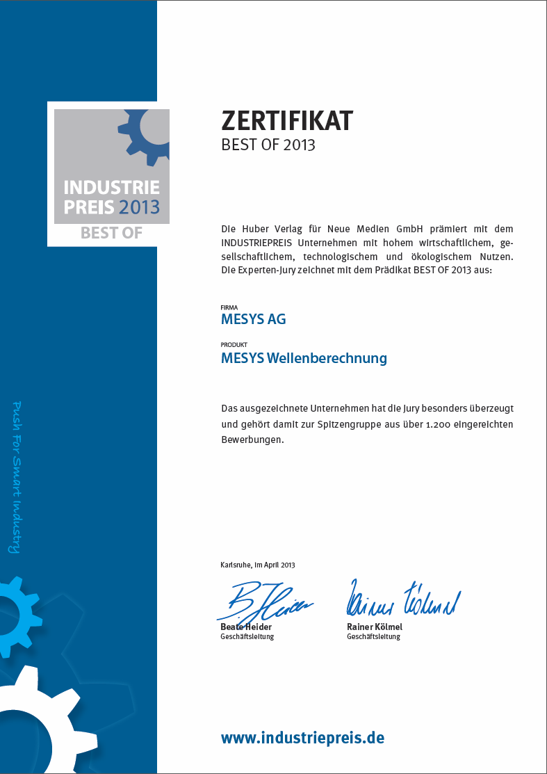 Die Experten-Jury zeichnet die MESYS Wellenberechnung mit dem Prädikat BEST OF 2013 aus. Das ausgezeichnete Unternehmen hat die Jury besonders überzeugt und gehört damit zur Spitzengruppe aus über 1.200 eingereichten Bewerbungen.